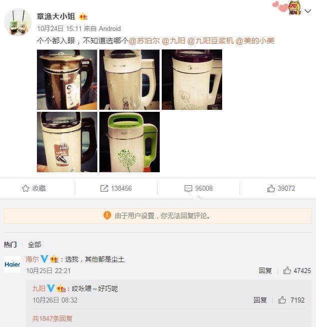 2016年10月24號一用戶在微博公開@幾位廠家,挑選豆漿機。