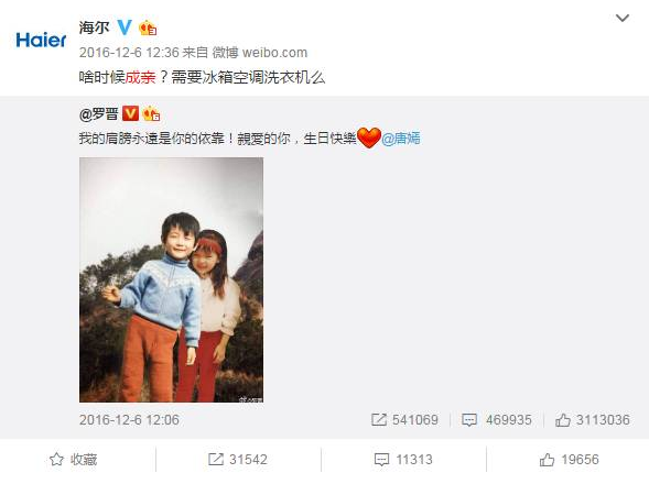 去年12月,正在熱播的《錦繡未央》男女主演羅晉唐嫣公布戀情。一般明星公布戀情都是各大官微爭相借勢的最好機會。海爾這次調皮的一問又一次打敗了其它營銷商家,獲得了大眾的關注。這次成功的借勢營銷范例,成為2016年度最佳借勢營銷案例。