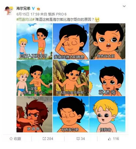 “海爾兄弟”的微信和微博賬號,也是人格化的可愛、呆萌的網紅形象,各種表情包,逗趣段子,有意思的周邊,動漫作品等。當然免不了之后還會從IP打造層面衍生新的故事,形成一個泛科幻IP生態圈。