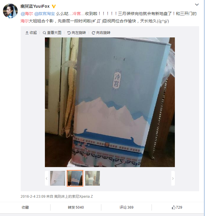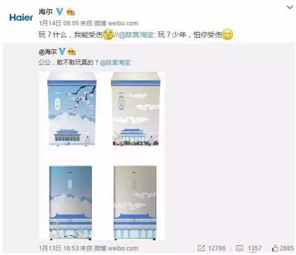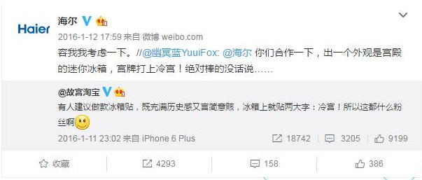 一位微博用戶在故宮淘寶提出要做冰箱貼的時候,想到@ 海爾 并戲謔到合作“冷宮”冰箱貼,海爾收到后予以回復并真的做出了冷宮冰箱,送到了用戶手上,并且寄給他一封信:每一個人的意見對我們都很重要。