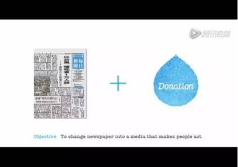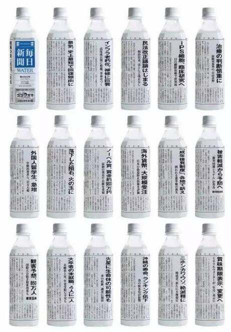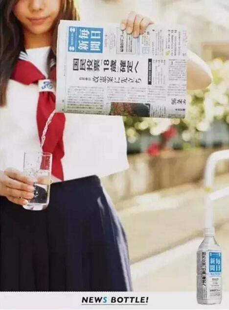 日本每日新聞發現,每天買報紙的年輕人越來越少,但是每天買瓶裝礦泉水的年輕人卻越來越多,設計師Yoshinaka Ono想出一個妙招,設計出了將新聞印到礦泉水瓶上成為新聞礦泉水(News Bottle),以此來吸引年輕人對報紙的關注。