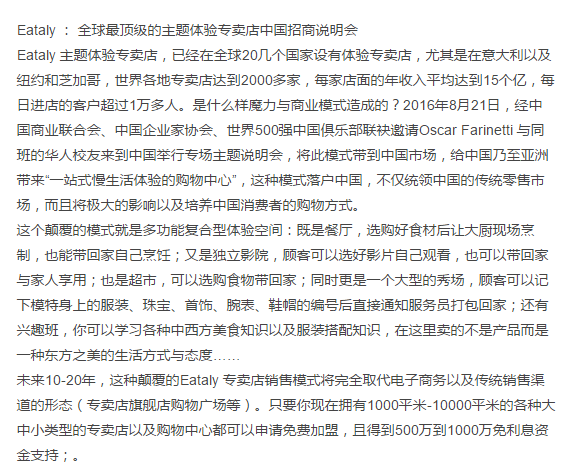小編在網(wǎng)上找到了Eataly在中國招商說明會的一段文字:
