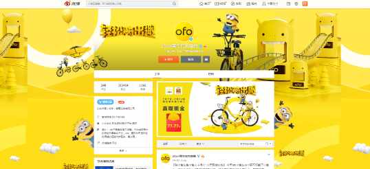 ofo小黃車的官方微博主頁也穿上了小黃人皮膚,活脫脫一幅小黃人定制廣告。