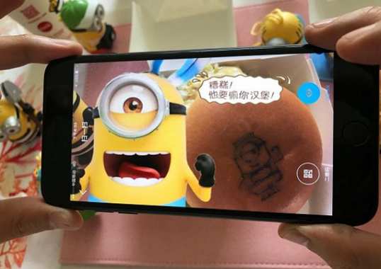 還利用AR互動(dòng)游戲的新玩法來植入品牌,消費(fèi)者通過掃描小黃人圖案,便可在手機(jī)里實(shí)現(xiàn)與小黃人互動(dòng)自拍,還能看到小黃人的動(dòng)畫彩蛋。