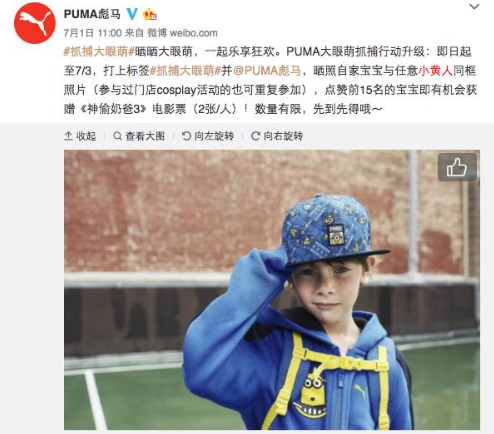 PUMA彪馬還在官方微博發(fā)起#抓捕大眼萌#的活動(dòng),并贈(zèng)送電影票,為《神偷奶爸3》電影的上映預(yù)熱。