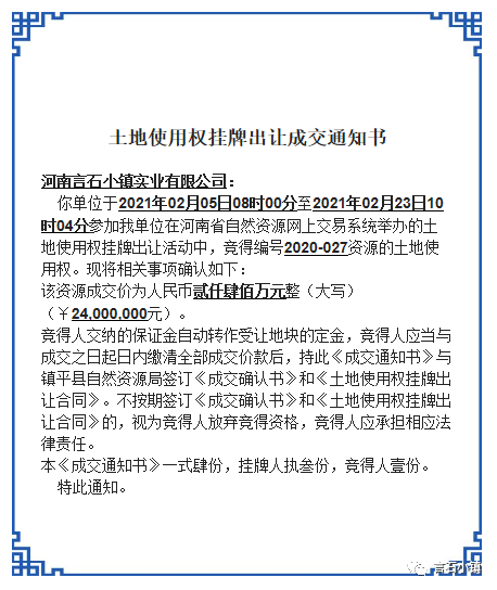 此次摘牌地塊為鎮(zhèn)土告字[2020]027-1號,位于G312國道晁陂段南側(cè),土地占地面積106335.315㎡,合計159.503畝,由言石小鎮(zhèn)競得該地塊的建設(shè)用地使用權(quán),土地成交總價2400萬元。