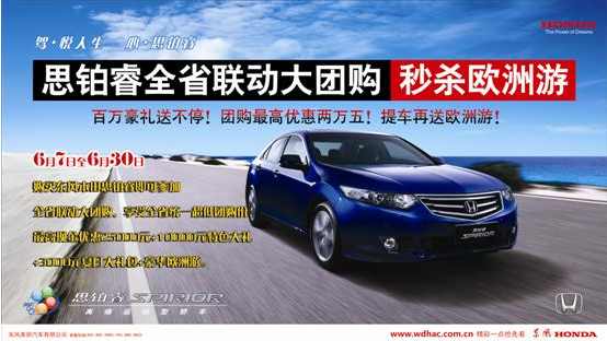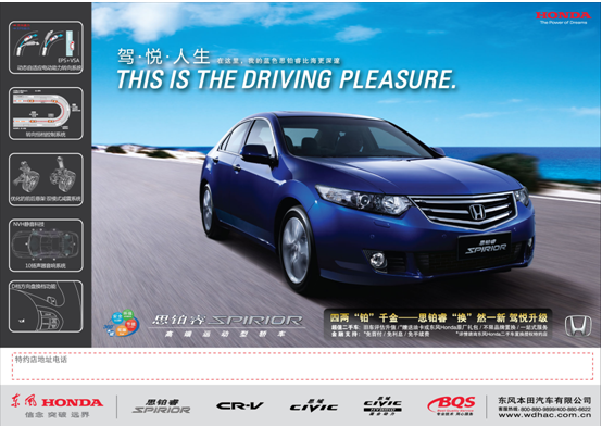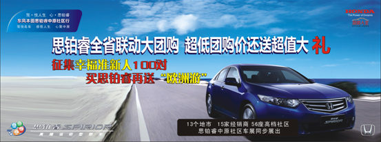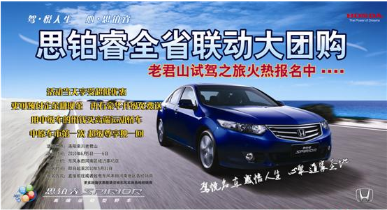 東風(fēng)本田力推的轎跑車“思鉑睿”在中國成熟的汽車氛圍里面對眾多競爭對手上市一年后市場表現(xiàn)很是不盡如意,河南區(qū)域15家東本經(jīng)銷企業(yè)也面臨巨大的壓力,在集體申請后廠家開始主導(dǎo)在河南地區(qū)選擇最后優(yōu)秀的本土智力機構(gòu)進行全新的市場營銷策劃和傳播活動。中寰創(chuàng)世憑借優(yōu)秀的創(chuàng)意實力和綜合服務(wù)執(zhí)行能力最終被廠家指定為2010年河南地區(qū)合作伙伴。隨后中寰創(chuàng)世伴隨東風(fēng)本田在河南地區(qū)開始了近兩年新的品牌及營銷格局。