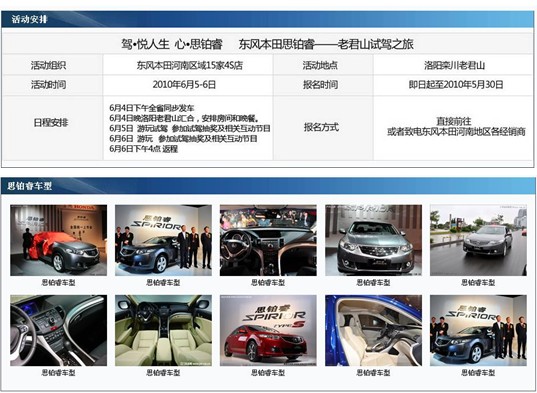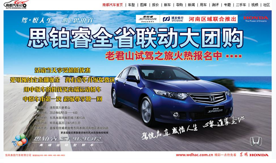從2010年初開始車市持續(xù)火爆,消費者爭先下訂,希望能夠盡快成為有車一族。但在挑選汽車這樣一個“大件”商品時,消費者卻又常常擔(dān)心自己不專業(yè),選不到合適的車型。想買熱門車型,又找不到機會試駕。針對此種情況,近日,東風(fēng)本田特別推出了“駕•馭人生,心•思鉑睿---東風(fēng)本田思鉑睿雞冠洞試駕游”。通過將“思鉑睿新車試駕”與“雞冠洞和老君山景區(qū)游覽”相結(jié)合,徹底顛覆傳統(tǒng)試駕,發(fā)起“試乘試駕”的創(chuàng)新型變革,讓消費者不僅能夠享受到思鉑睿高檔運動型轎車的駕馭樂趣,也能在活動中親近自然、回歸自然,享受大自然的樂趣。