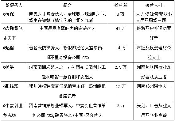 六位微博名人分屬鄭州不同行業(yè)的微博名人,首先在區(qū)域上來說,這些微博名人的粉絲 大部分都是鄭州的,在傳播上可以做到有效的鄭州區(qū)域人群覆蓋。另外他們分屬不同的行業(yè),在傳播上也就保證了人群的覆蓋的廣度。同時(shí),每場的十位幸運(yùn)粉絲也 有效做到了活動信息及山西喬東家特色美食的二次傳播。